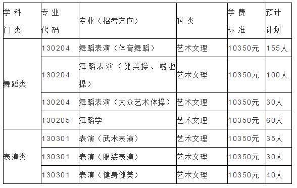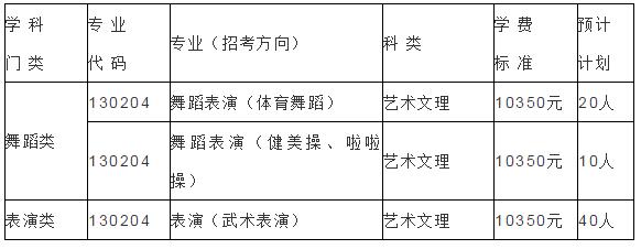 表演類招生省份:北京、河北、山西、內蒙古、浙江、安徽、山東、河南、湖北、湖南、廣東、重慶、陜西、甘肅、黑龍江、廣西。江西(只招武術表演方向)、江蘇(只招服裝表演方向)。