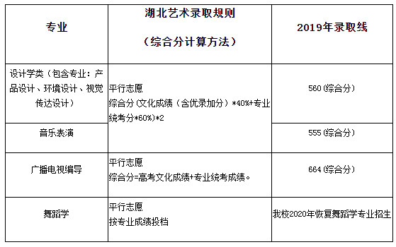 1、取得所在省份相應專業統考合格證,文化成績達到相應批次錄取控制分數線,根據考生所在省份規定的投檔規則計算藝術綜合投檔成績(綜合分)從高到低擇優錄取,湖北省2020年綜合分計算方法與2019年相同。