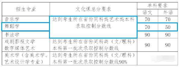 5. 各專業加設文化課單科(按滿分150 分計)和文化課成績總分(不含政策性加分,下同)錄取控制分數線,具體要求如下: