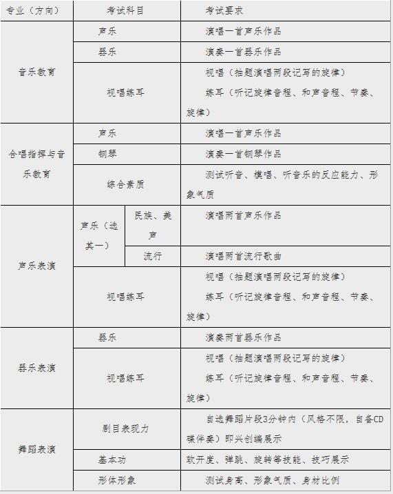 1、音樂教育、器樂表演方向:男生1.65米(含)以上,女生1.55米(含)以上;