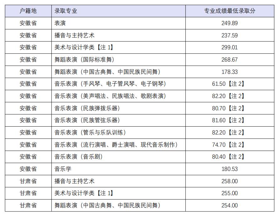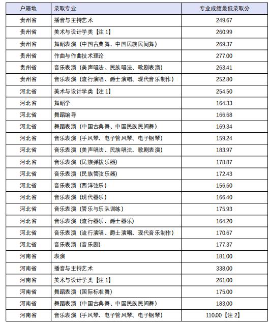 1. 投檔考生文化成績達(dá)到生源所在省份招生考試機(jī)構(gòu)劃定的藝術(shù)類本科文化錄取控制分?jǐn)?shù)線,按專業(yè)統(tǒng)考成績從高分到低分排序錄取的專業(yè)統(tǒng)考成績最低錄取分【分科類計(jì)劃(江蘇省、廣西壯族自治區(qū))按科類分別排序錄取